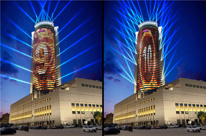 整個(gè)燈光秀以水墨開(kāi)啟,向觀眾充分展現(xiàn)十三朝古都大西安的深厚文化底蘊(yùn)。燈光秀共分為“炫舞長(zhǎng)安”、“古韻長(zhǎng)安”、“皇冠歡迎您”三個(gè)環(huán)節(jié)。燈光圖像為緩慢動(dòng)態(tài),結(jié)合城市夜間旅游系統(tǒng),媒體幕墻表現(xiàn)圖像,塔樓夜景保留星空畫(huà)面,夜間模式保留城市天際線。