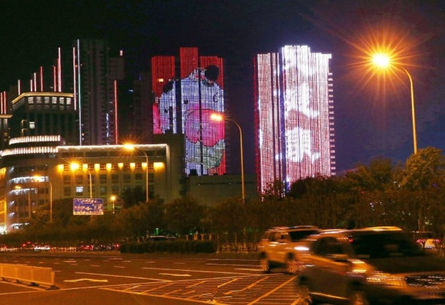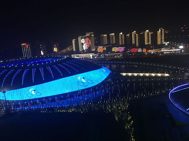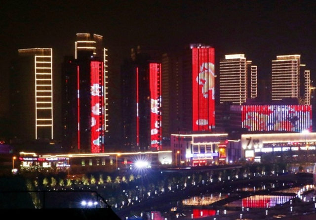 津門華燈初上,在奧體中心,隨著奧體中心“水滴”燈光的開啟,周圍樓宇、路燈也逐漸被點(diǎn)亮。18棟樓將“水滴”、“飛碟”和“游泳跳水館”圍在正中間,墻面上的動畫燈光與場館燈光遙相呼應(yīng),顏色相互變化。時有“大雁飛過”,時而有天津標(biāo)志性建筑悅動在墻上,時而出現(xiàn)可愛的“津娃”形象。精彩絕倫,美不勝收。