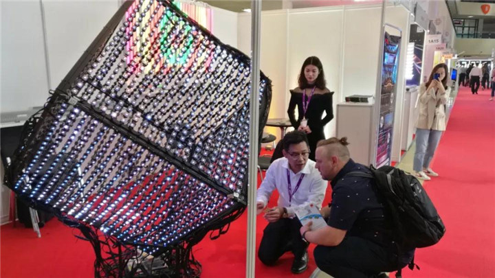 3*5米的展臺,2400個燈點(diǎn)P22AP組成的多媒體立方和30條數(shù)碼管的排列成的立體屏吸引了眾多客戶的目光。
