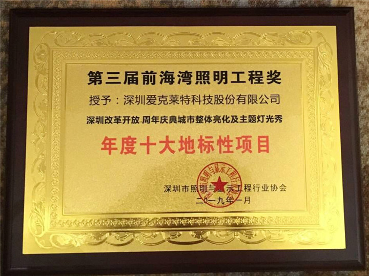 頒獎(jiǎng)典禮上,由愛(ài)克萊特提供亮化產(chǎn)品的深圳改革開(kāi)放40周年慶典城市整體亮化及主題燈光秀獲得第三屆前海灣照明工程獎(jiǎng)十大地標(biāo)性項(xiàng)目,愛(ài)克萊特副總經(jīng)理張麗上臺(tái)代表公司領(lǐng)取獎(jiǎng)項(xiàng)。